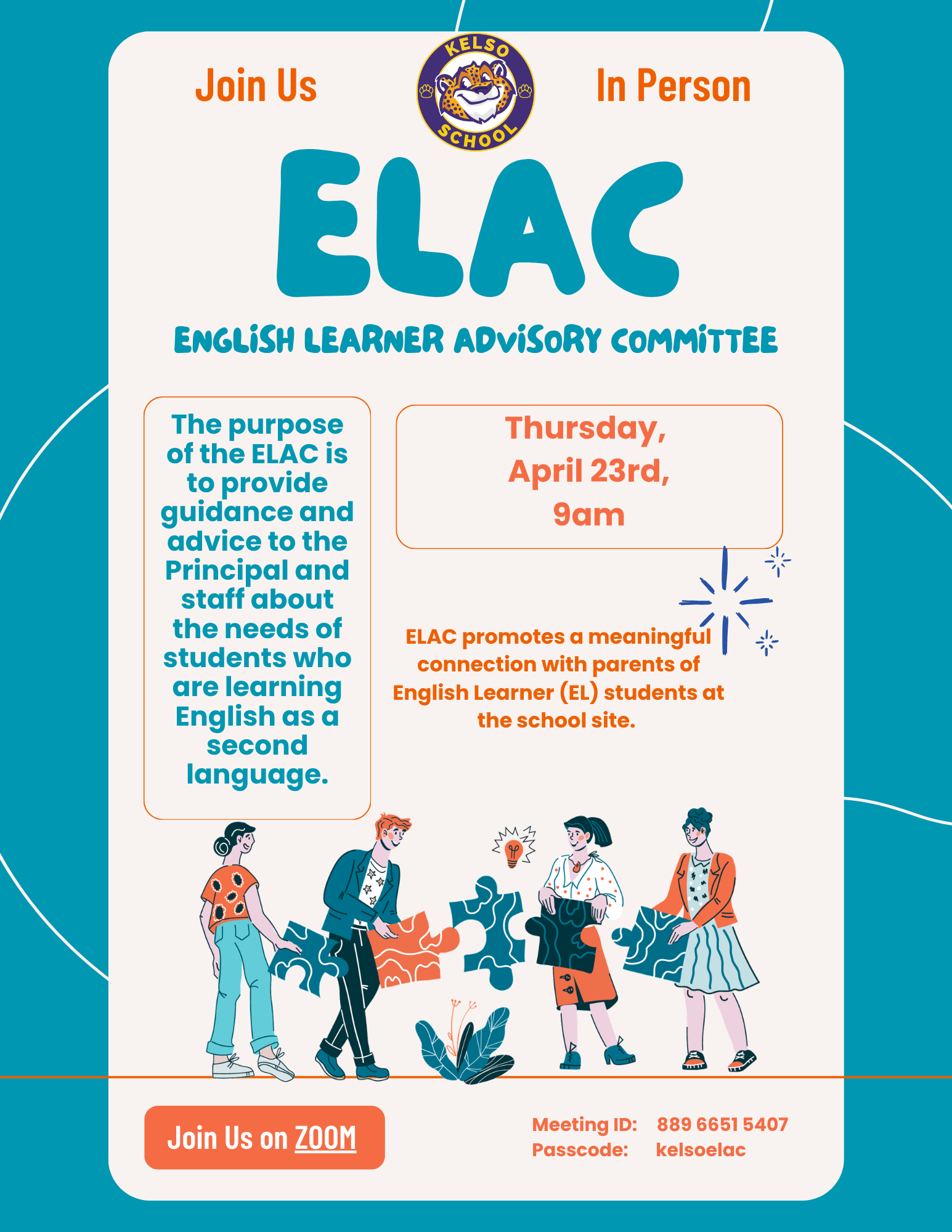 Join us in Person or on Zoom to learn about the latest with Kelso. Únase a nosotros en persona o en Zoom para conocer las últimas novedades de Kelso. https://inglewoodusd.zoom.us/j/88081388941?pwd=fu5rdYqzPQSbShOCVrYo0h3Uy72601.1 Meeting ID: 880 8138 8941 Passcode: twp@kelso