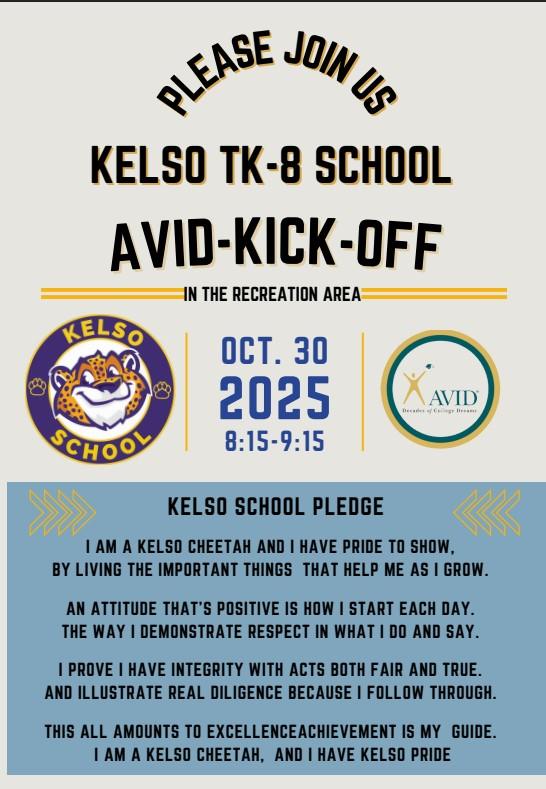 AVID (Advancement Via Individual Determination) Kick-Off Kelso is committed to college and career readiness. Join us as we prepare our cheetahs for their futures now!Kelso está comprometido con la preparación universitaria y profesional. ¡Únete a nosotros para preparar a nuestros guepardos para el futuro!