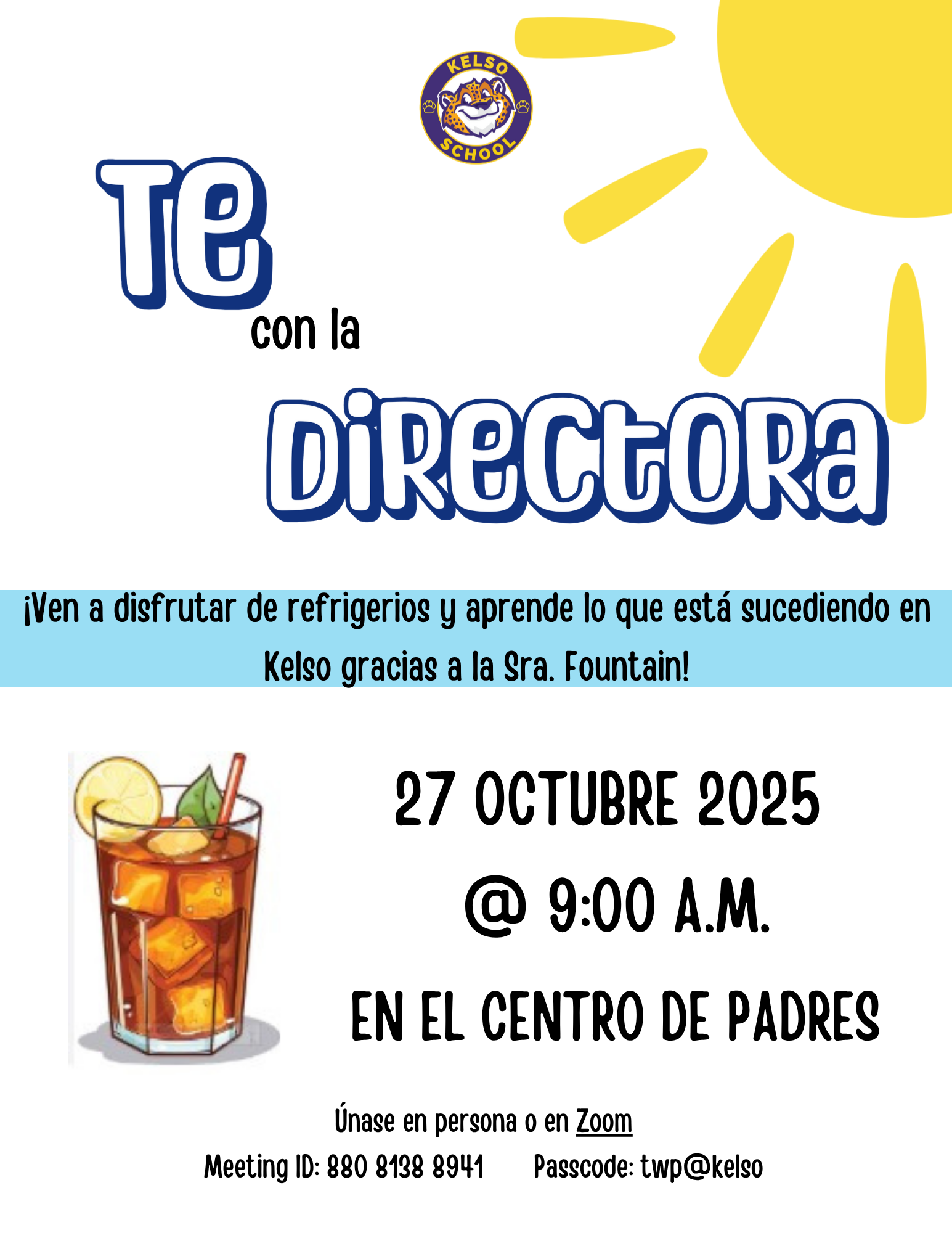 Tea with the Principal Join us in Person or on Zoom to learn about the latest with Kelso.Únase a nosotros en persona o en Zoom para conocer las últimas novedades de Kelso.https://inglewoodusd.zoom.us/j/88081388941?pwd=fu5rdYqzPQSbShOCVrYo0h3Uy72601.1 Meeting ID: 880 8138 8941 Passcode: twp@kelso
